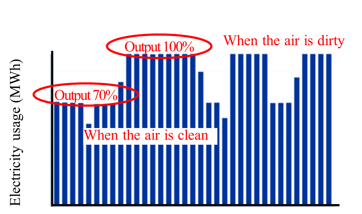 However, as the degree of air pollution in a mine differs during times of blasting, shotcrete, mucking, and other operations, the output of the blower has to be adjusted, according to the work being done in the mine, after confirming the measurement results of CO2, dust, oxygen concentration, and toxic gases at the site. Fig. 14(c) gives an example of the operation of a blower at a construction site. At this site, the airflow was controlled at 100% output when the air was dirty, and at 70% output when it was less dirty, thereby significantly reducing the energy consumption of the ventilation system.