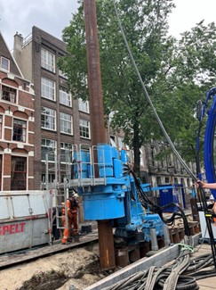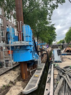 Following a successful test phase in 2023 at Singel Amsterdam, G-Kracht initiated the first rack of the commercial phase around April 2025. The project has continued up to date, with nearly 164 piles being installed as of August 2025. The project aligns with carbon neutrality; all working machines, from the service crane to the GYRO PILER™, etc., are fully electric. The trees along the quay wall have been saved using the CLAMP CRANE™ CB2-11. With the GYRO PILER, the tubular piles are pressed and rotated directly into the existing masonry quay wall; thus, the new piles replace the old quay wall, which starts functioning immediately.