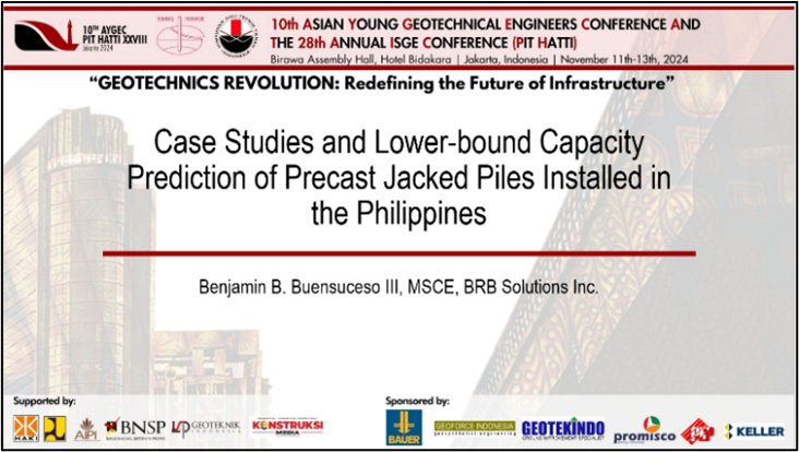 I presented my research on this at the 10th Asian Young Geotechnical Engineers Conference (AYGEC) in Jakarta, Indonesia, held from November 11 to 13, 2024. I also presented this research at the 2nd National Conference 2024 of the Philippine Society of Soil Mechanics and Geotechnical Engineering (PSSMGE) in December 2024 at the University of the Philippines Diliman.