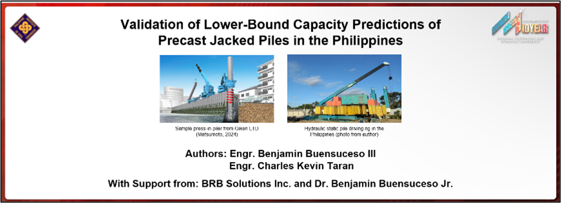 To validate these capacity predictions, I tested my alternative lower-bound predictions on a new set of data compiled from a different project site and area in the Philippines, though using relatively similar pile jacking equipment. I co-wrote a short paper with my colleague at BRB Solutions Inc., Engr. Charles Kevin Taran, on this case study for the 2025 Philippine Institute of Civil Engineers (PICE) Midyear Conference held in Iloilo, Philippines, from June 25 to 27, 2025.
